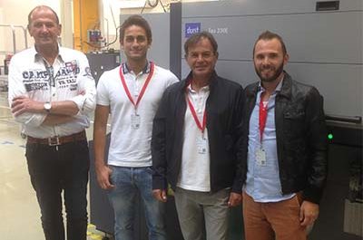 (L-R) Florian Koessler, sales Durst Phototechnik AG, with the Pubbliservice team Filippo Salati, vice president, Stefano Salati, president, and Franco Rossi, pre-press engineer Italian…